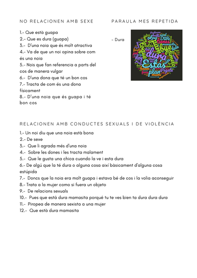En una tercera etapa: vam dissenyar un dossier amb diferents activitats per que els alumnes de 1r i 2n d’ESO treballessin a les tutories, i així es conscienciessin sobre el contingut masclista de les lletres de les cançons de reggaeton. Després vam recollir tots els treballs que van fer; alguns havien escollit una cançó i havien escrit les frases masclistes que contenía, altres van canviar la lletra d’una cançó per que no fos masclista, van “ridiculitzar” les expressions d’algunes cançons, van recollir les cançons que coneixien que tenien una lletra més masclista...